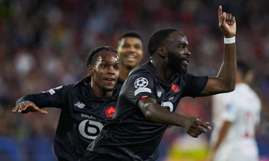 October 20 2021. 10 hours agoLilles Jonathan Ikone right celebrates after scoring his sides second goal during the Champions League group G soccer match between Sevilla and Lille at the Ramon Sanchez Pizjuan stadium in Seville Spain Tuesday Nov.